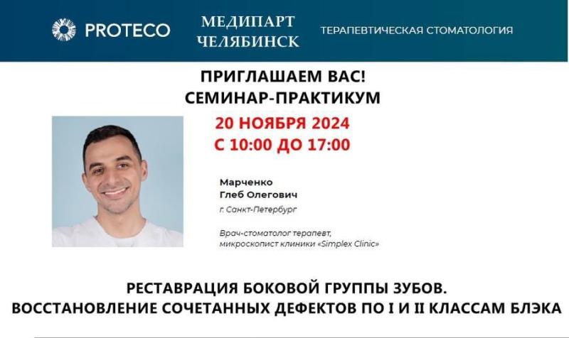 Приглашаем Вас на семинар-практикум по теме "Реставрация боковой группы зубов. Восстановление сочетанных дефектов по I и II классам блэка", который состоится 24 ноября 2024 г. Мероприятие будет проходить по адресу г. Челябинск, ул. Салавата Юлаева, д. 17Г, отель "Мелиот" с 10:00 до 17:00.